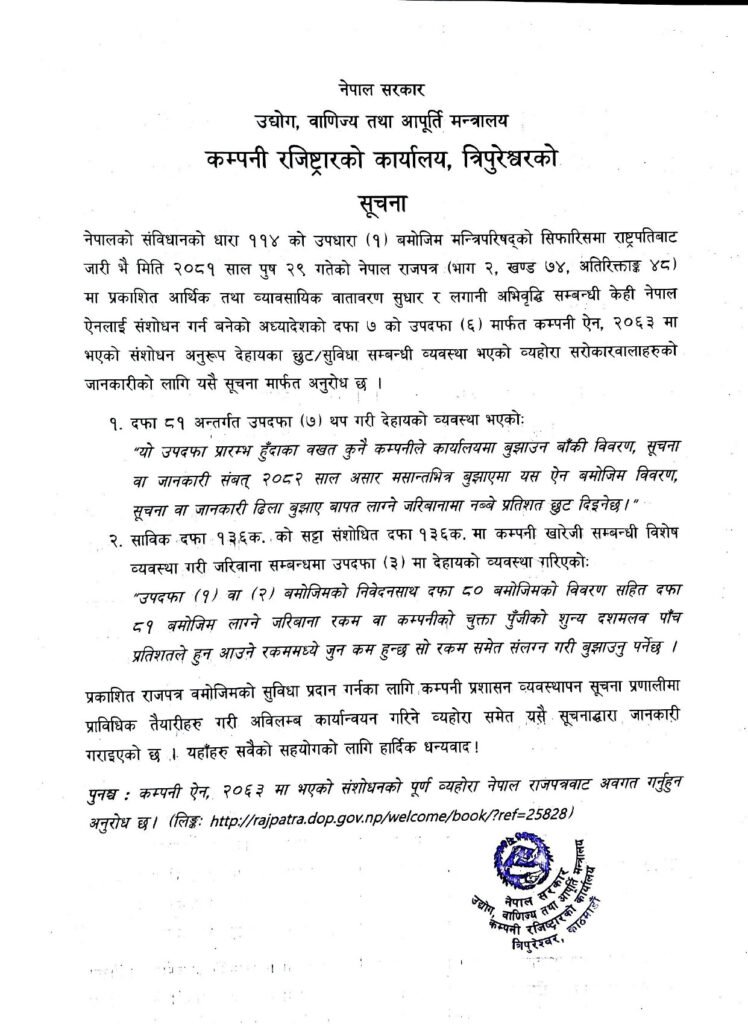 - हाल सम्म विवरण, सूचना वा जानकारी बुझाउन ढिला भएका कम्पनीहरूलाई ९० प्रतिशतसम्म जरिवाना मिनाहा गर्ने व्यवस्था गरिएको छ।